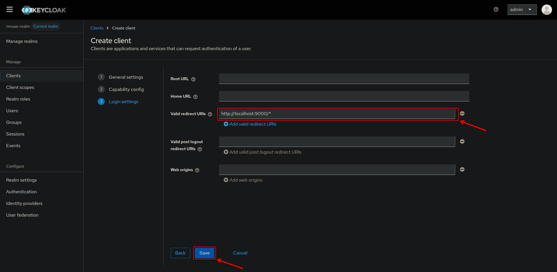 - In the last step of creating a client to enable the nmaas-platform to log in via Keycloak, specify