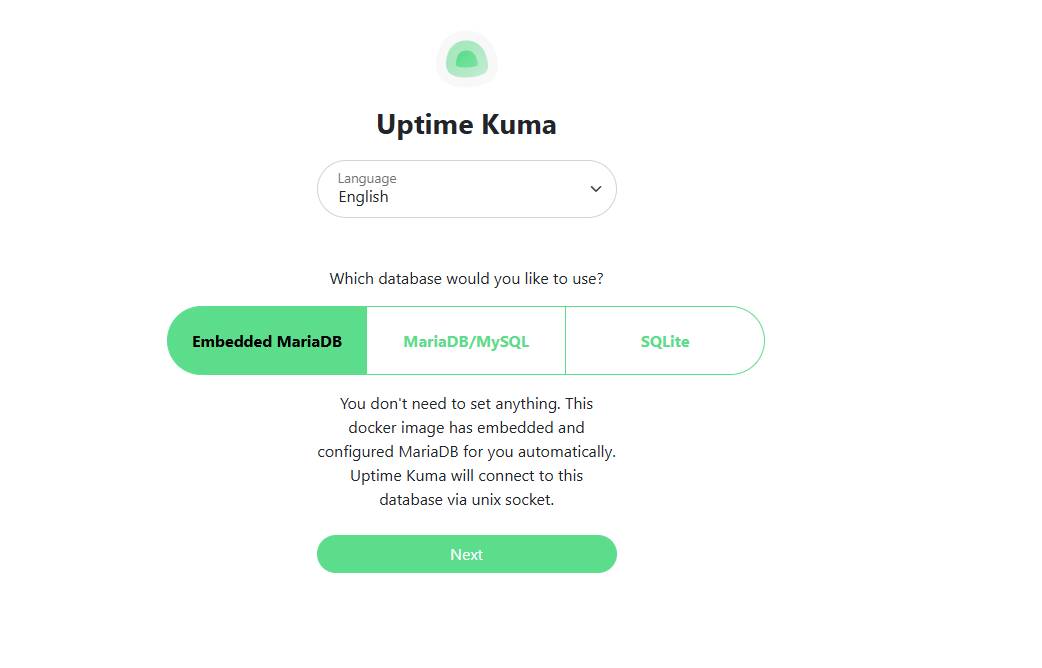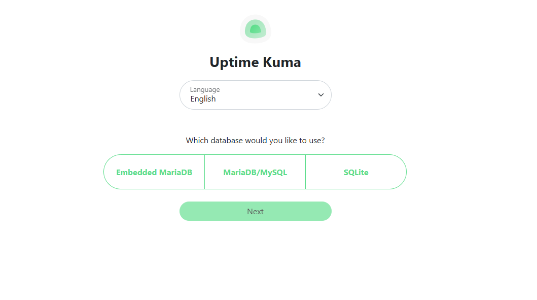- Once the application is deployed, access the Uptime Kuma web interface. You will be greeted by a welcome page, asking you to select the preferred database (Fig. 4).